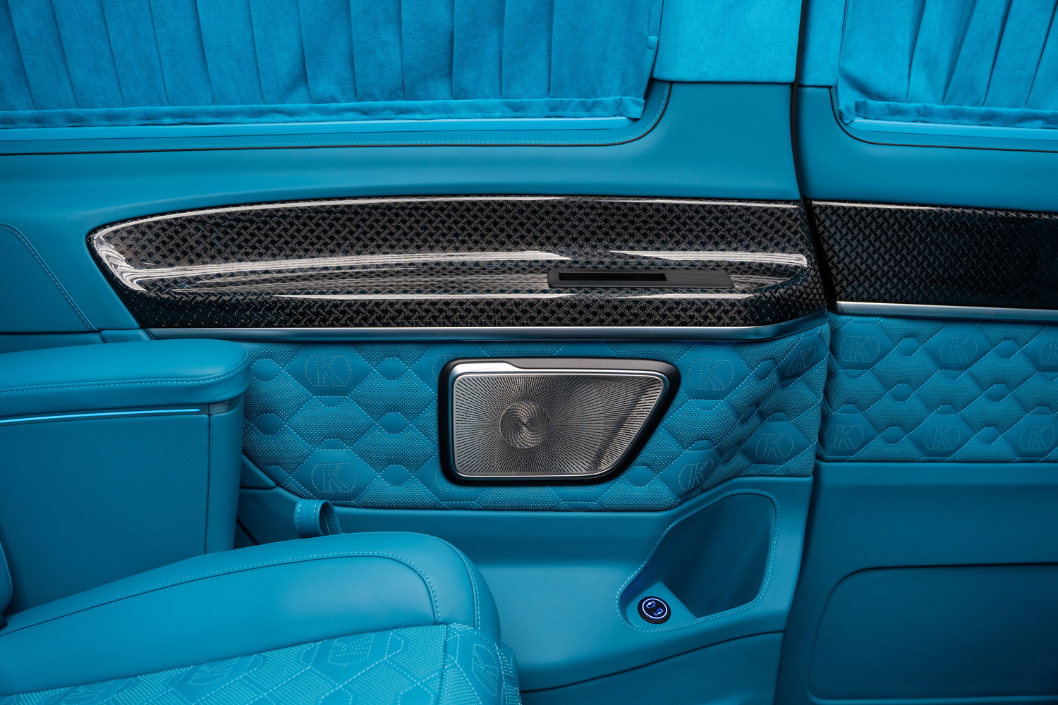 Die Seitenverkleidungen folgen dem einheitlichen Farbkonzept des Innenraums. Lederflächen mit dekorativer Steppung werden mit Carbon-Elementen und integrierter Akustik kombiniert.