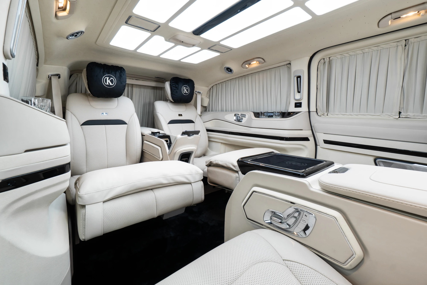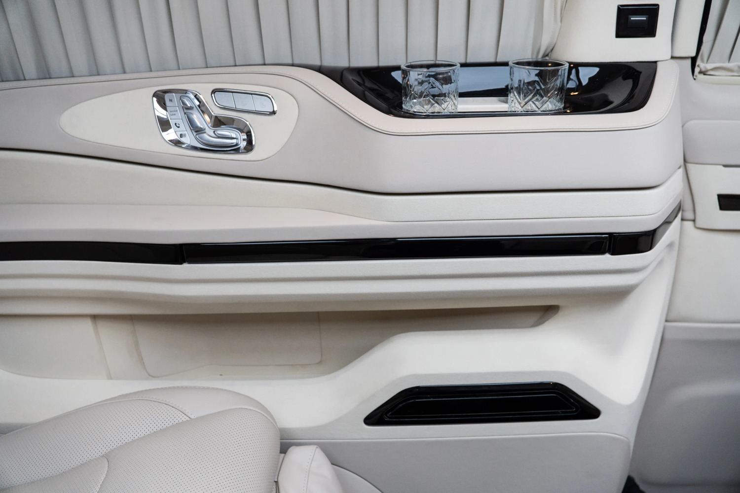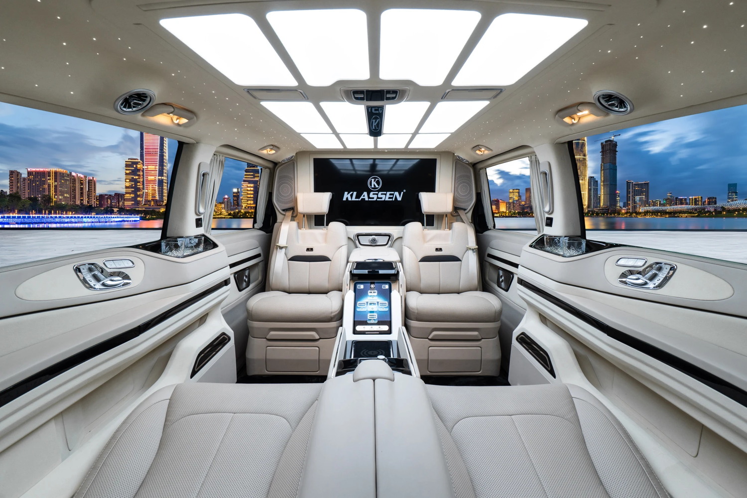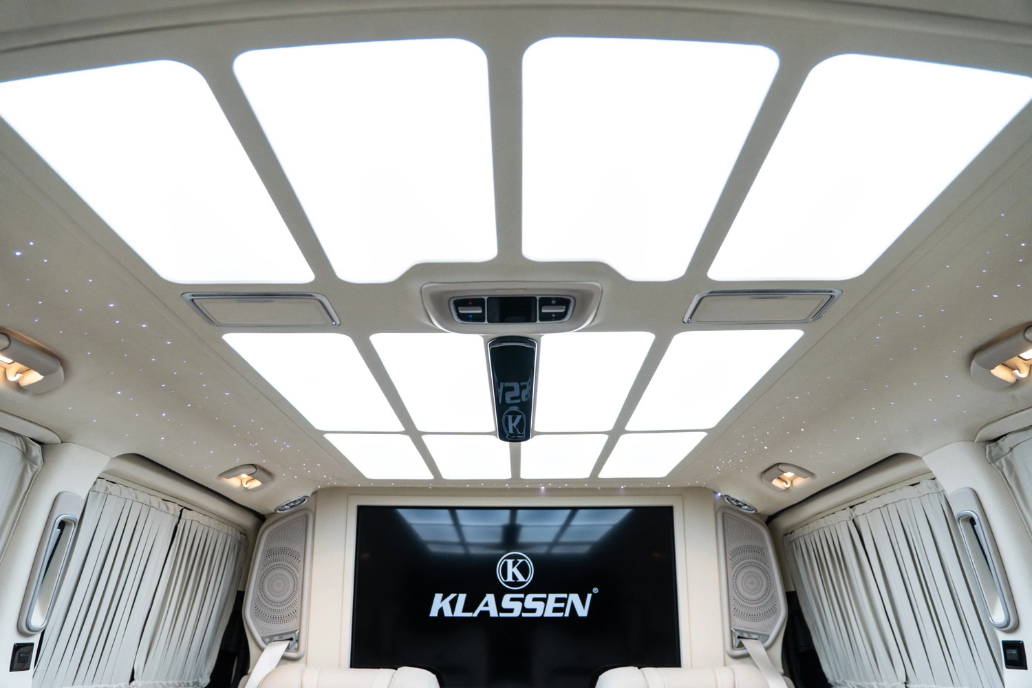 Die Frontpartie entspricht dem aktuellen Design der V-Klasse mit vergrößertem Kühlergrill und moderner LED-Optik. Je nach Basisausstattung kommen AMG Line oder Exclusive Elemente zum Einsatz, die die Gestaltung von Stoßfänger und Grill bestimmen. KLASSEN erhält diese Lösungen ohne übermäßige Änderungen, damit das Fahrzeug im geschäftlichen Umfeld angemessen bleibt. Die Abmessungen entsprechen dem Serienstandard, wodurch der Einsatz in Tiefgaragen, Städten und an Flughäfen ohne Einschränkungen möglich ist.