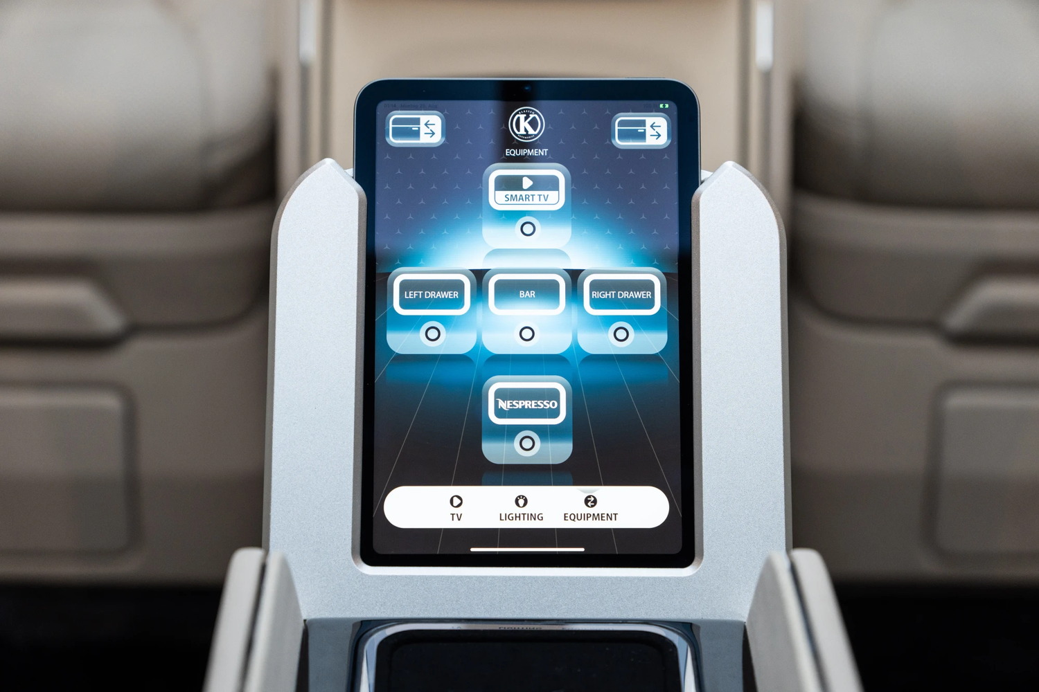 Zwischen den Sitzen befindet sich ein zentrales Modul, das Arbeits- und Komfortfunktionen vereint. Es enthält eine integrierte Nespresso-Kaffeemaschine, einen Kühlschrank mit Minibar und geschlossene Ablagen.