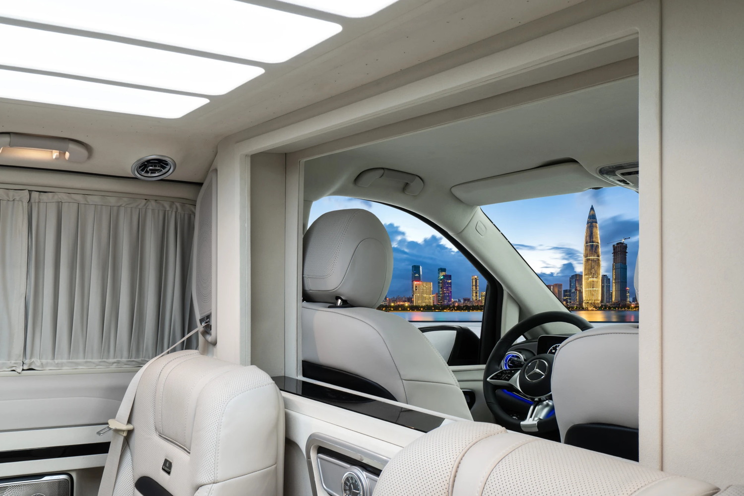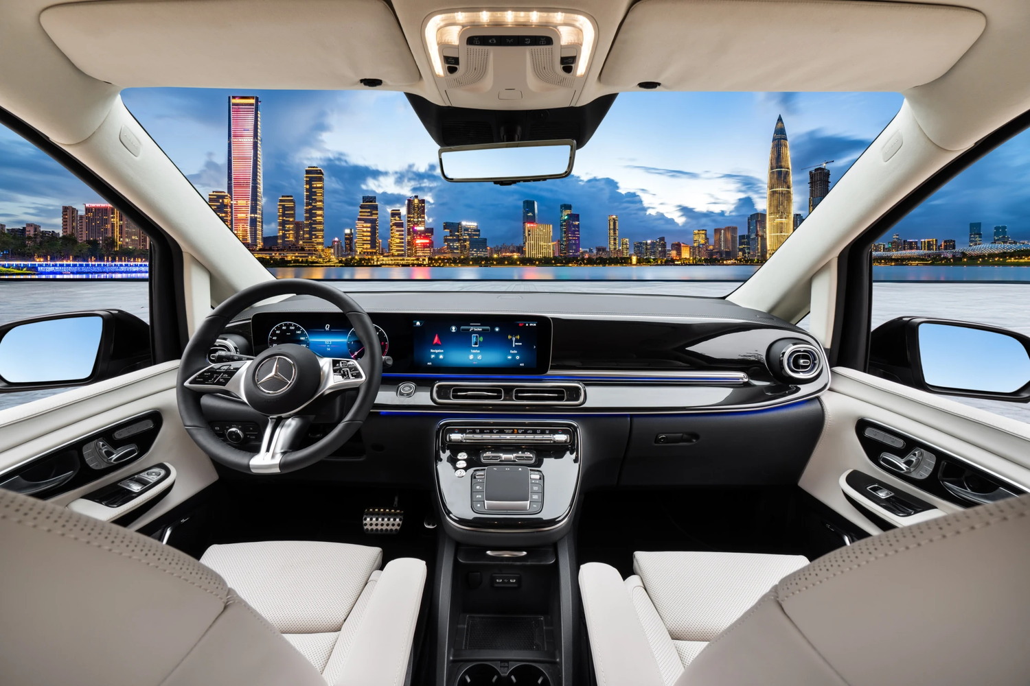 Der vordere Teil behält weitgehend die Mercedes-Benz Architektur bei. Die überarbeitete V-Klasse verfügt über ein neues Cockpit mit zwei 12,3-Zoll-Displays, modernem Lenkrad und aktualisierten Assistenzsystemen.