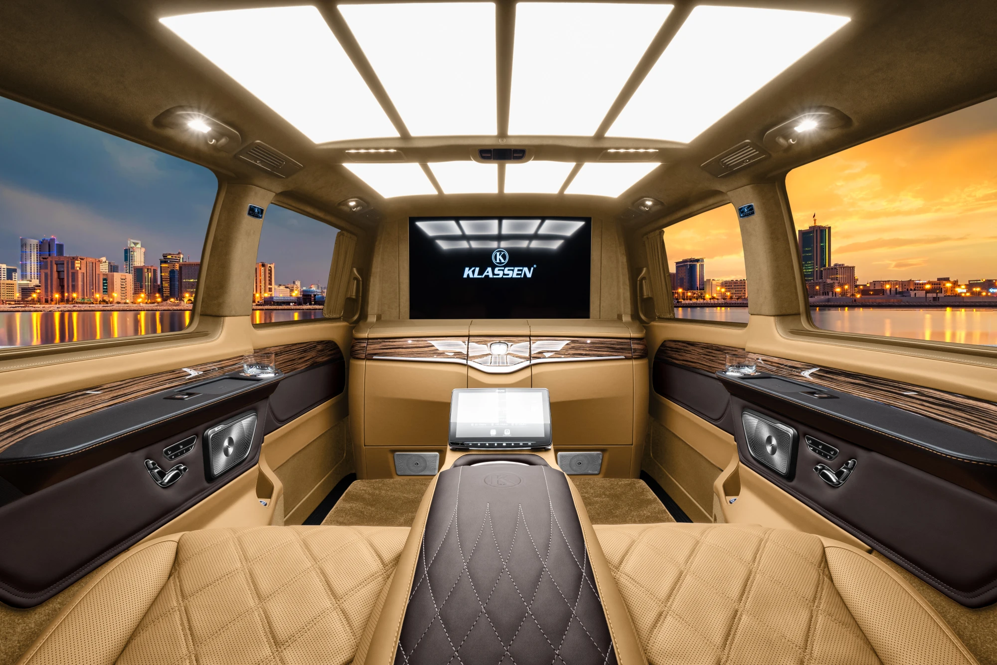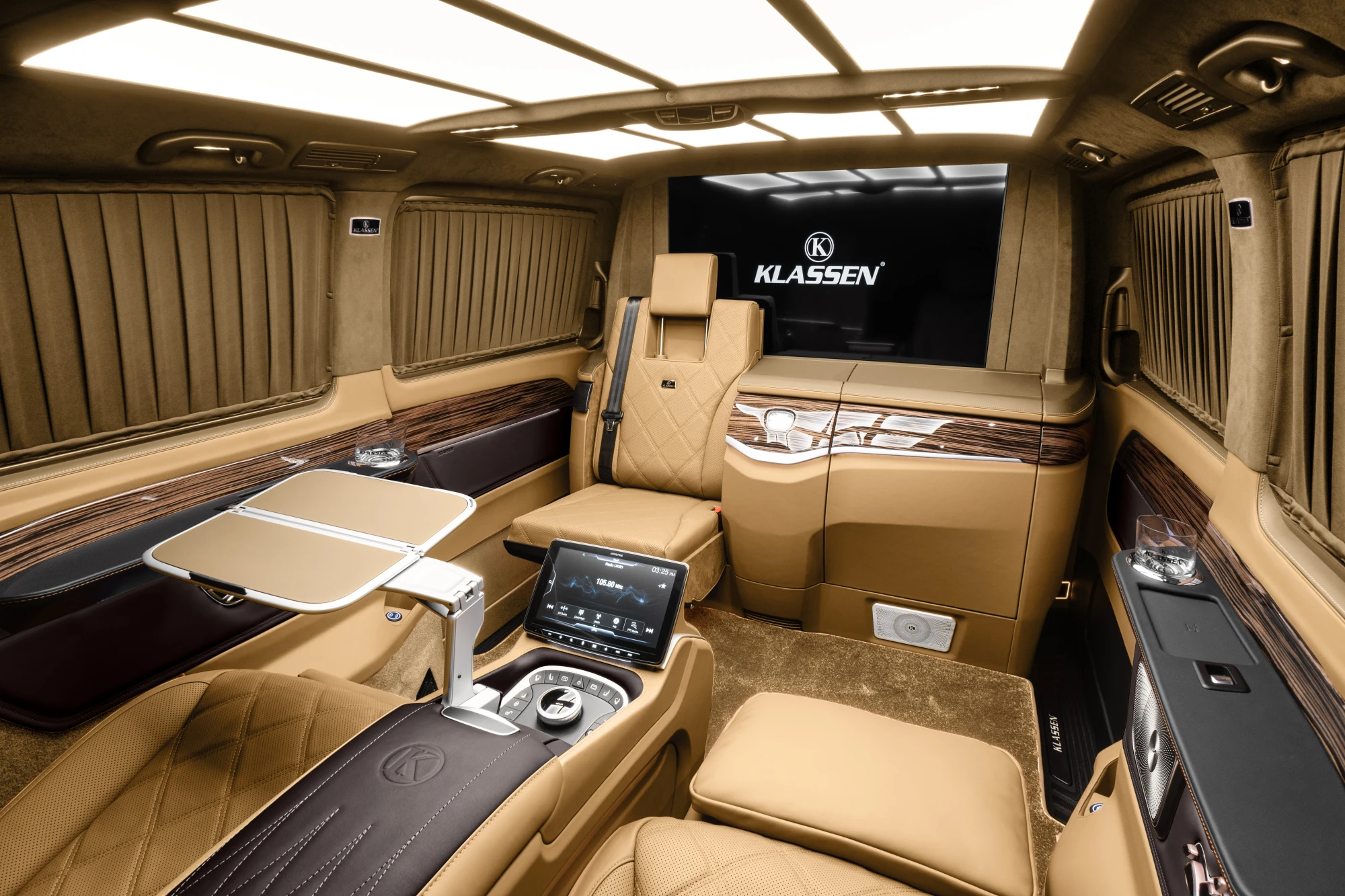 Система с опускным стеклом и подъемным телевизором отделяет VIP-салон от водительского отсека