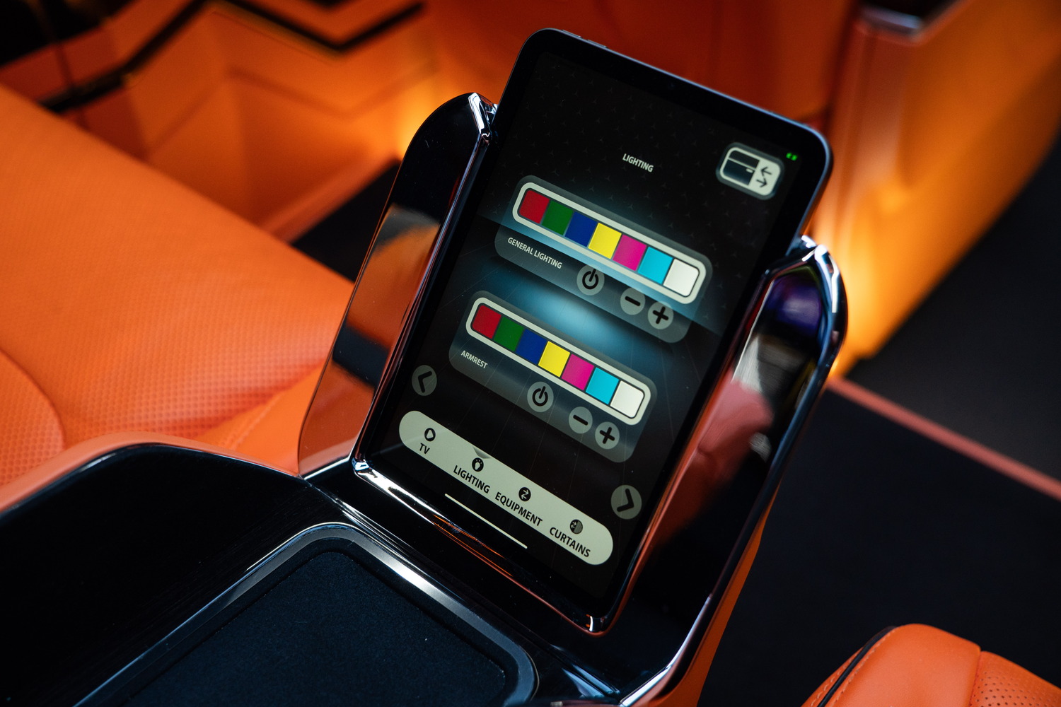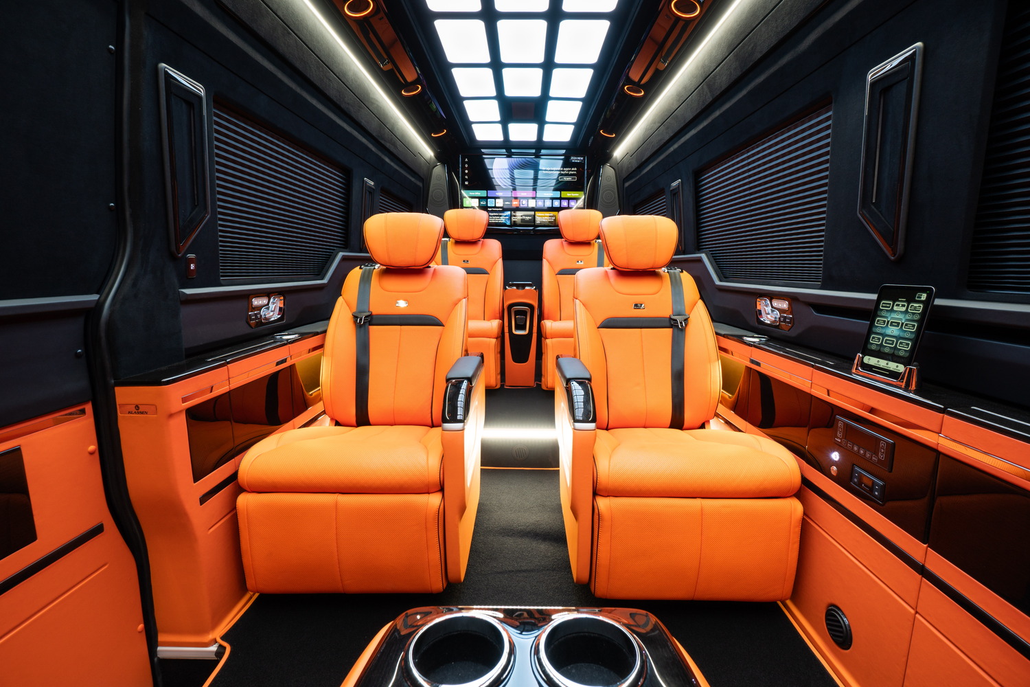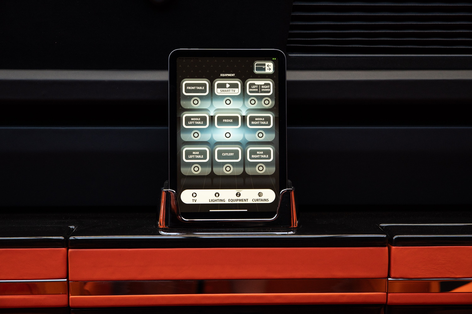 В VIP-зоне устанавливается система KLASSEN Remote System. Она обеспечивает централизованное управление функциями интерьера, такими как освещение, климатизация и мультимедиа, через iPad. Для этого интегрируется iPad Mini, который закрепляется в док-станции. Док-станция одновременно служит для надежной фиксации и функции зарядки устройства.