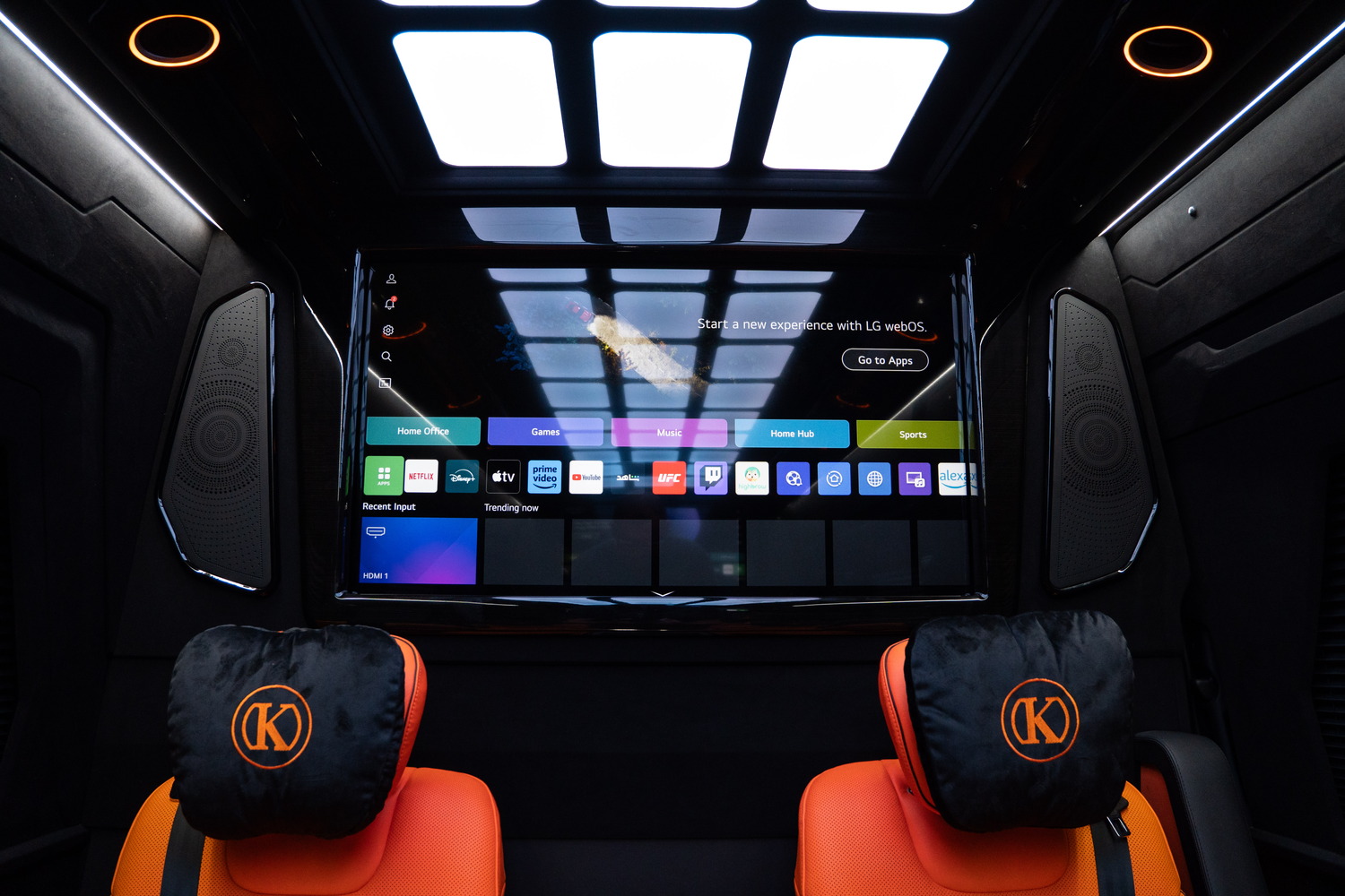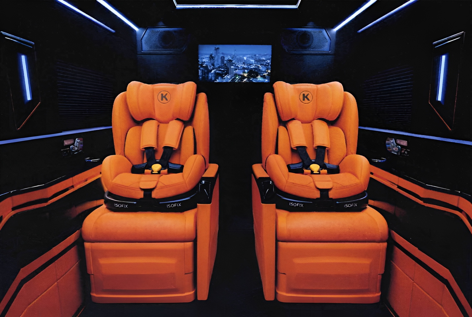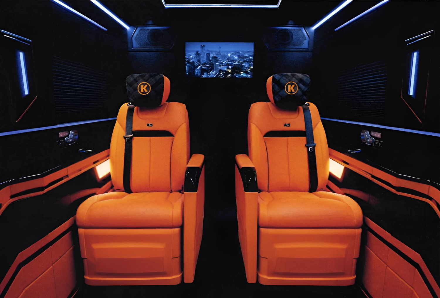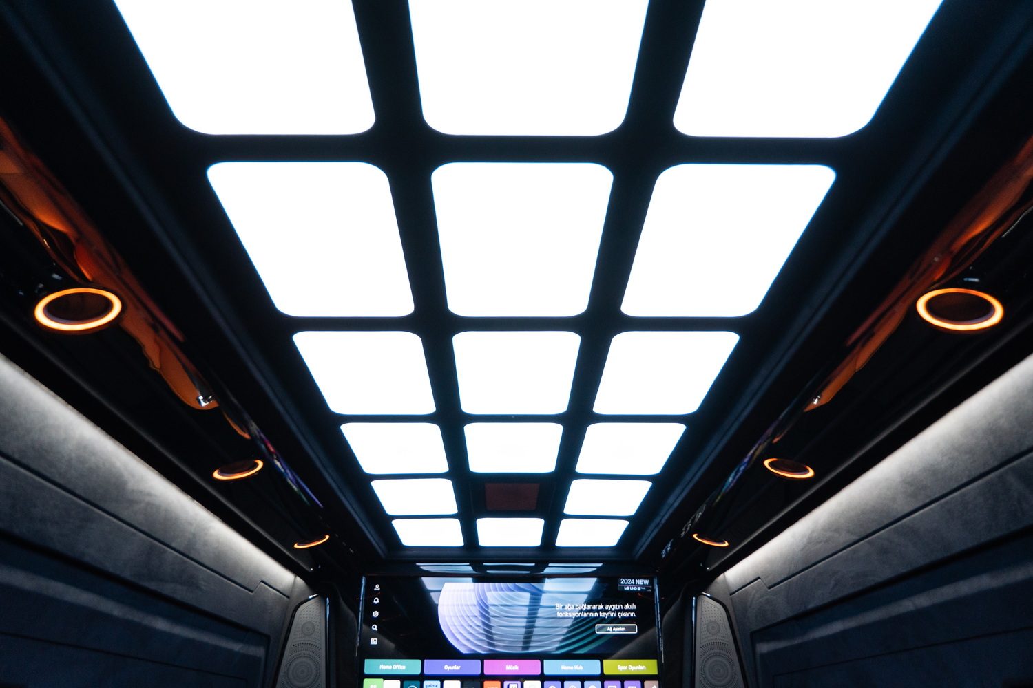 VIP-зона отделяется от водительского отсека передней ТВ-перегородкой. Эта конструкция служит организации приватности, акустическому разделению зон, а также визуальному экранированию пассажиров от рабочей зоны водителя.