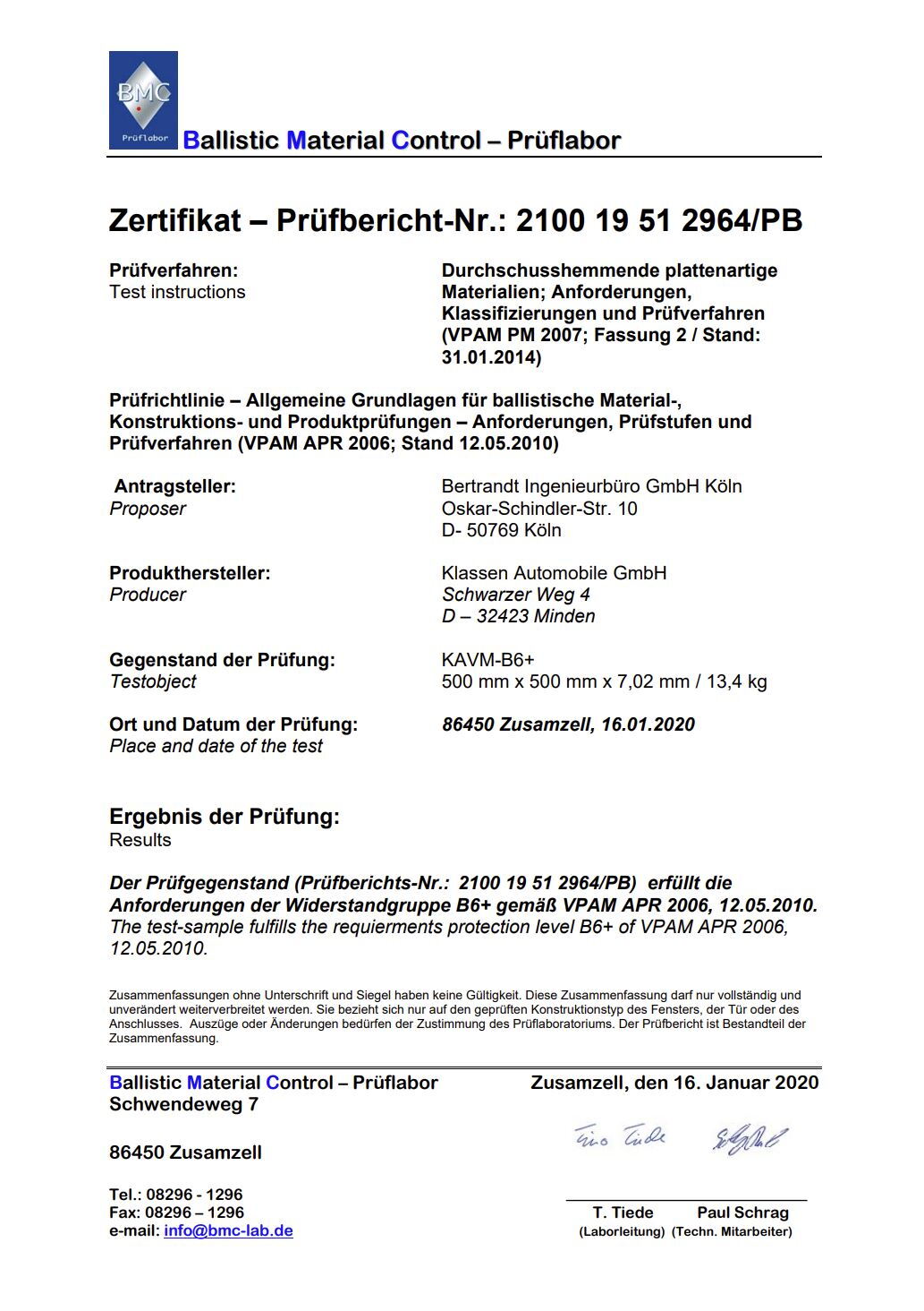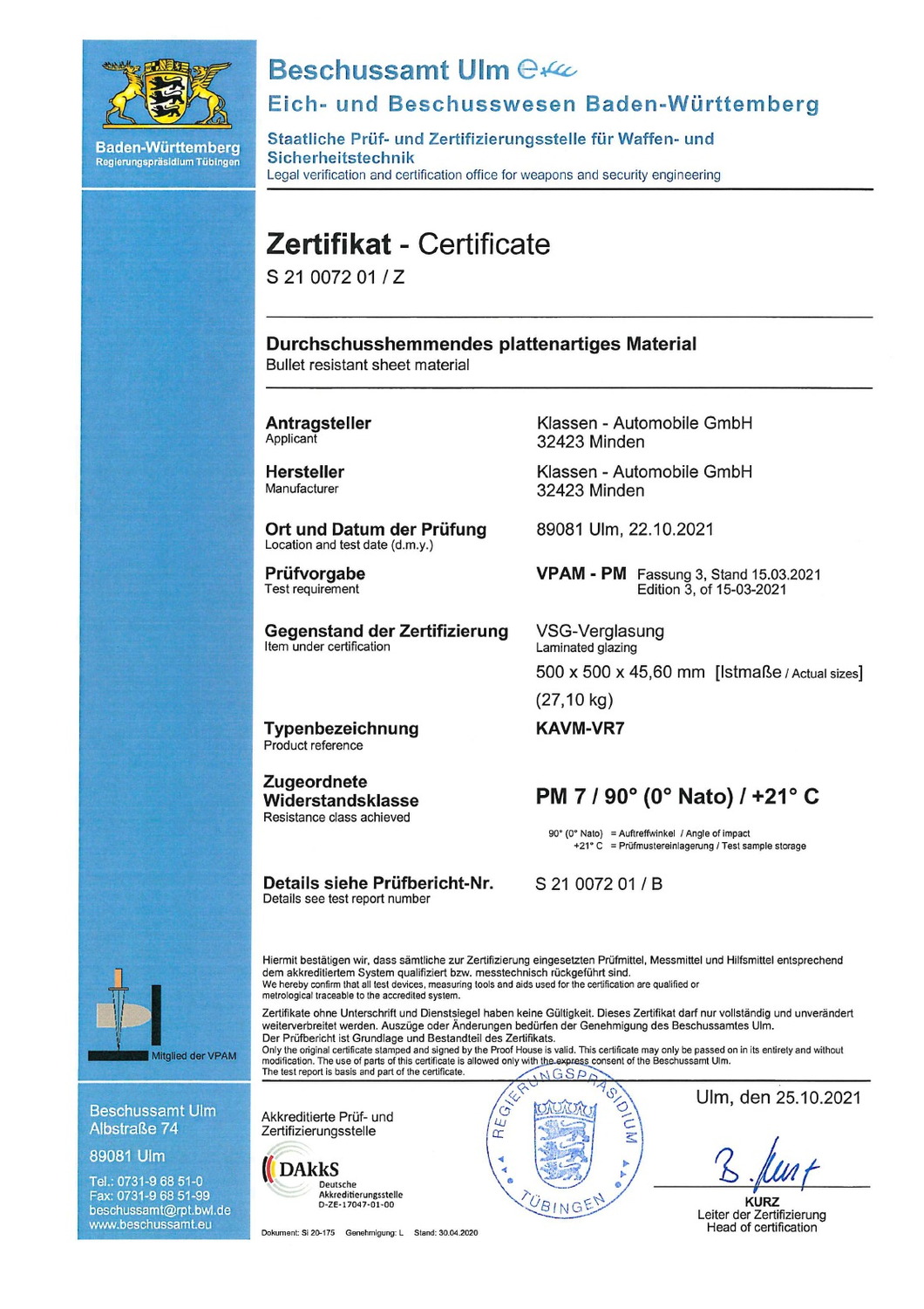 Предусмотрено наличие сертификатов соответствия на баллистическое стекло и броневую сталь с подтверждением результатами огневых испытаний, включая реальные отстрелы образцов. Сертификаты материалов и протоколы испытаний входят в комплект документации автомобиля.