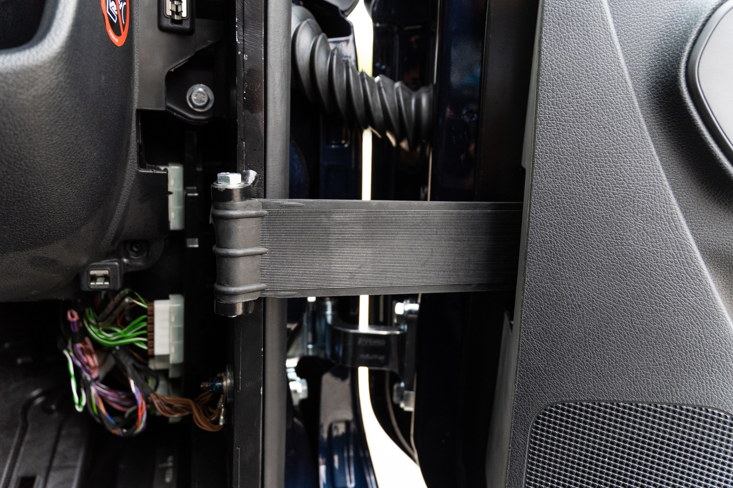 После бронирования двери имеют значительно увеличенную массу. В проекте предусмотрены специально разработанные дверные петли, выполненные как фрезерованные CNC-узлы и закреплённые непосредственно к броневой структуре, а не к штатному кузову.
