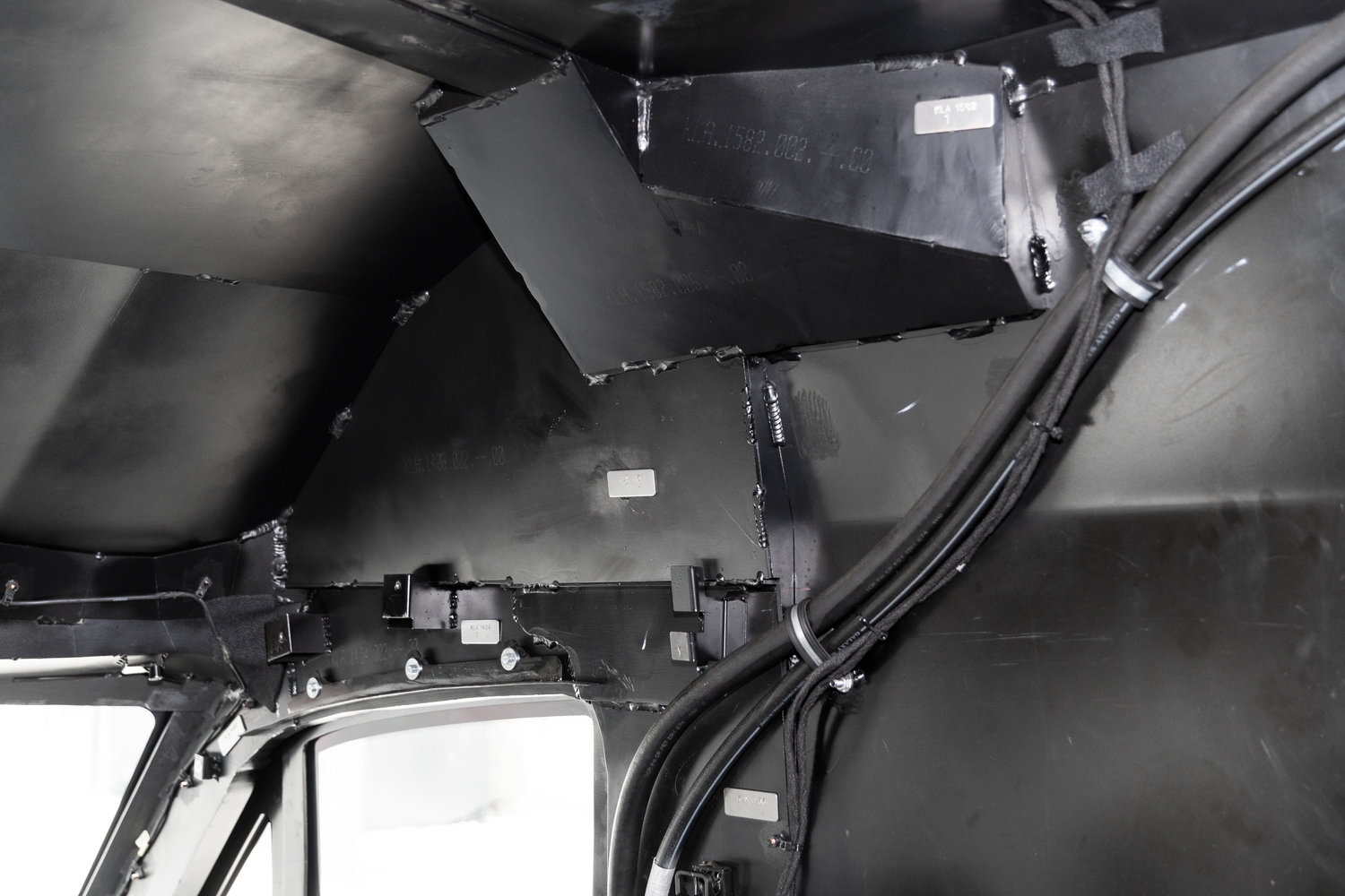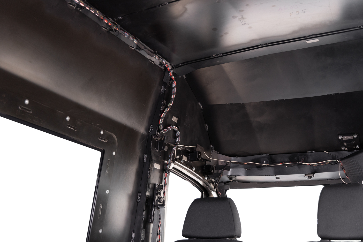 Конструкция крыши, а также стойки полностью облицовываются. Тем самым создаётся единая геометрия интерьера с аккуратными переходами и скрытыми структурными элементами кузова и броневой структуры.