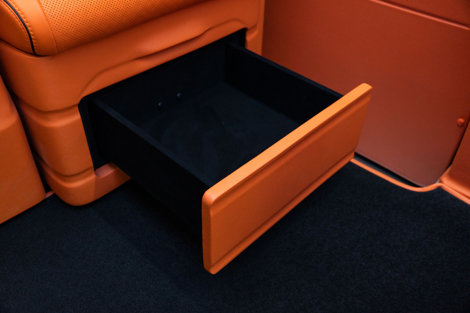 Под передними VIP-сиденьями интегрируются электрически выдвижные ящики. Они служат для структурированного и скрытого хранения документов, личных вещей и аксессуаров. С производственной точки зрения это включает направляющие, электрический привод, фиксацию в закрытом положении, а также согласование с кабельными трассами и сервисным доступом под сиденьем.